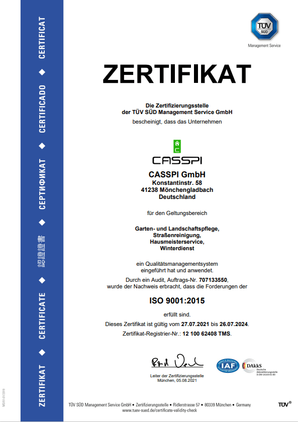 The latter includes seven aspects that serve to ensure customer satisfaction. These are: customer focus, leadership, commitment of people, processes and organization, improvement, decision making and relationship management. ISO 9001 provides recommendations for action for each of these sub-areas, compliance with which is confirmed by the corresponding certificate. What does that mean for you? Quite simply - at CASSPI, you, the customer, are the focus of our daily activities.